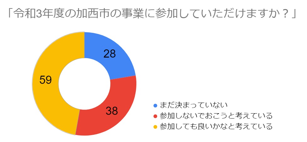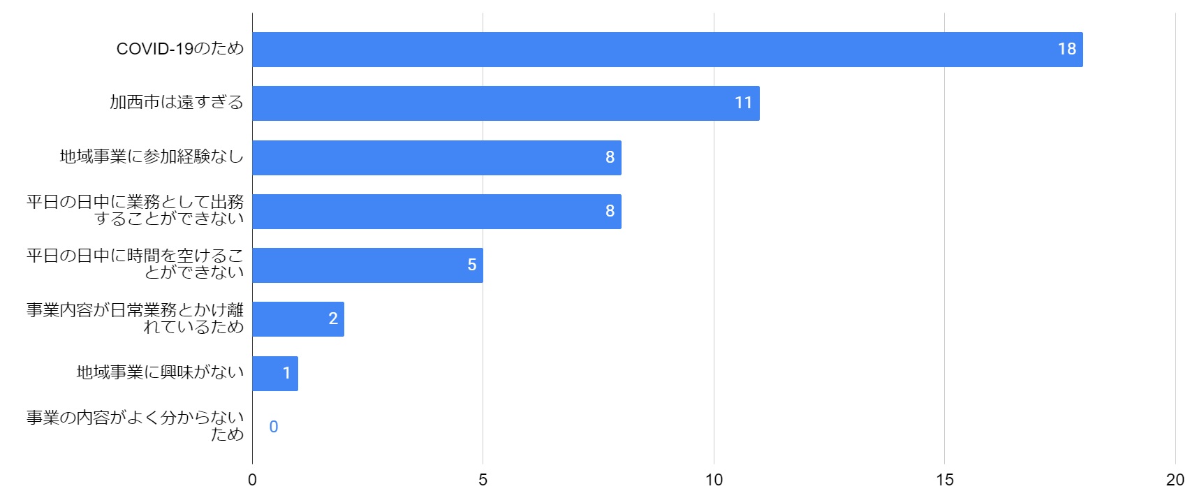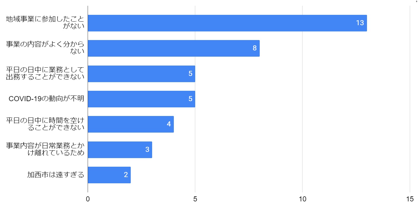 最も多かったのは、新型コロナウイルスのためでした。続いて、加西市までの距離的な問題、地域事業への参加経験がない、予定の調整が困難などが挙げられました。