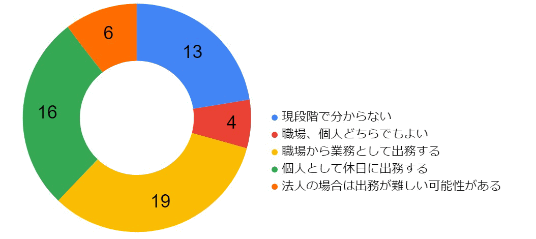 出務の形式については、「個人として出務する」と答えた方と「職場からの出務が難しい」と答えた方と合わせると22名いらっしゃいました。