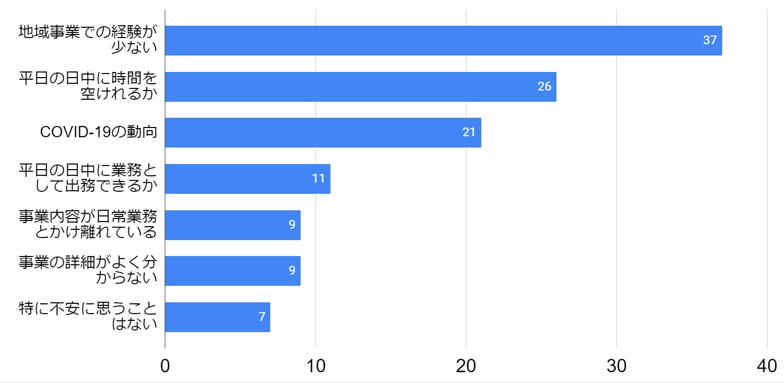 心配に感じることとしては「地域事業での経験が少ない」が一番多く、半数以上の方が心配な点として挙げておられました。予定を調整できるかどうか、新型コロナウイルス(COVID-19)の影響を心配される声も多かったです。