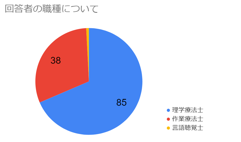 ご回答いただいた方は理学療法士85名、作業療法士38名、言語聴覚士1名でした